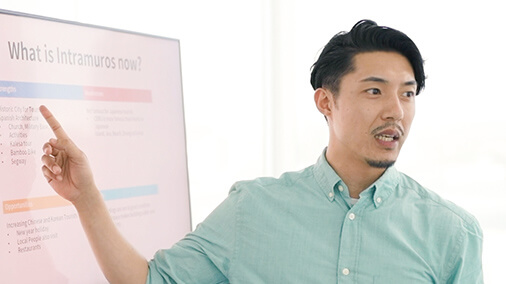 海外事業でリーダーシップを発揮できない理由のひとつとして、間違った英語を話すことに対する羞恥心などの心理的要因が大きく関わっています。このプログラムではフィリピンに足を踏み入れると同時に日本語使用は一切禁止となり、自らの英語力とビジネス経験を頼りにマニラ市内を駆け回り、市場調査や事業計画の立案、現地スタッフへのプレゼンテーションなどを行っていきます。英語に対する心理的障壁を打破し、海外環境下でのビジネスを体験することであなたを世界で活躍するグローバル人材に育てる、5日間の「グローバル人材養成プログラム」です。