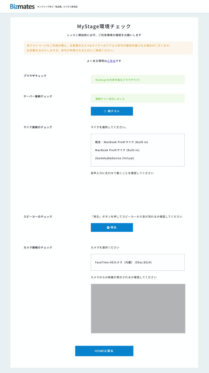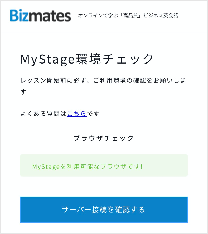 会員ページ「My Bizmates」の「●●さんの予約状況」にあります「MyStage環境チェック」より、ご利用のデバイスの環境を確認してください。