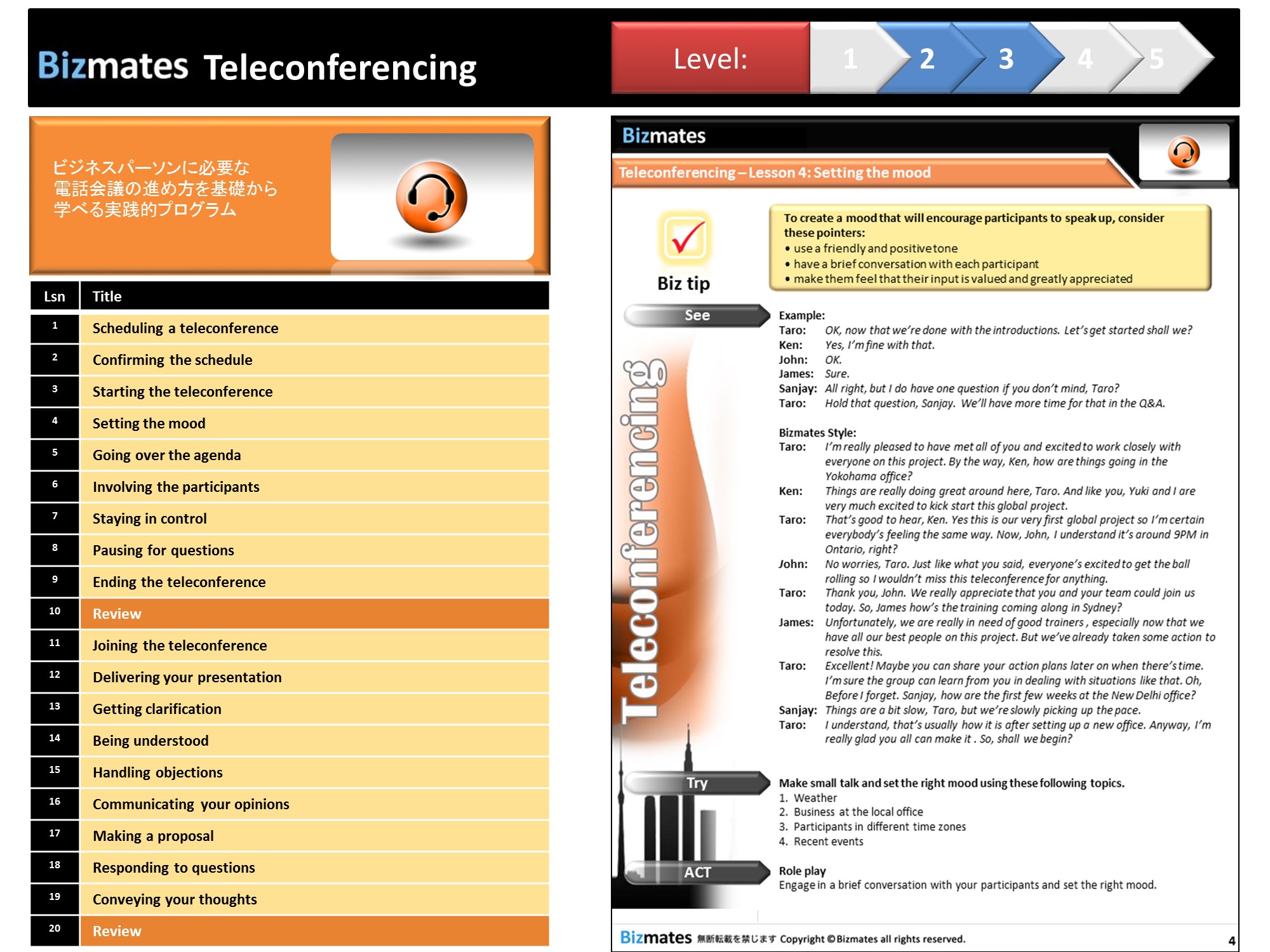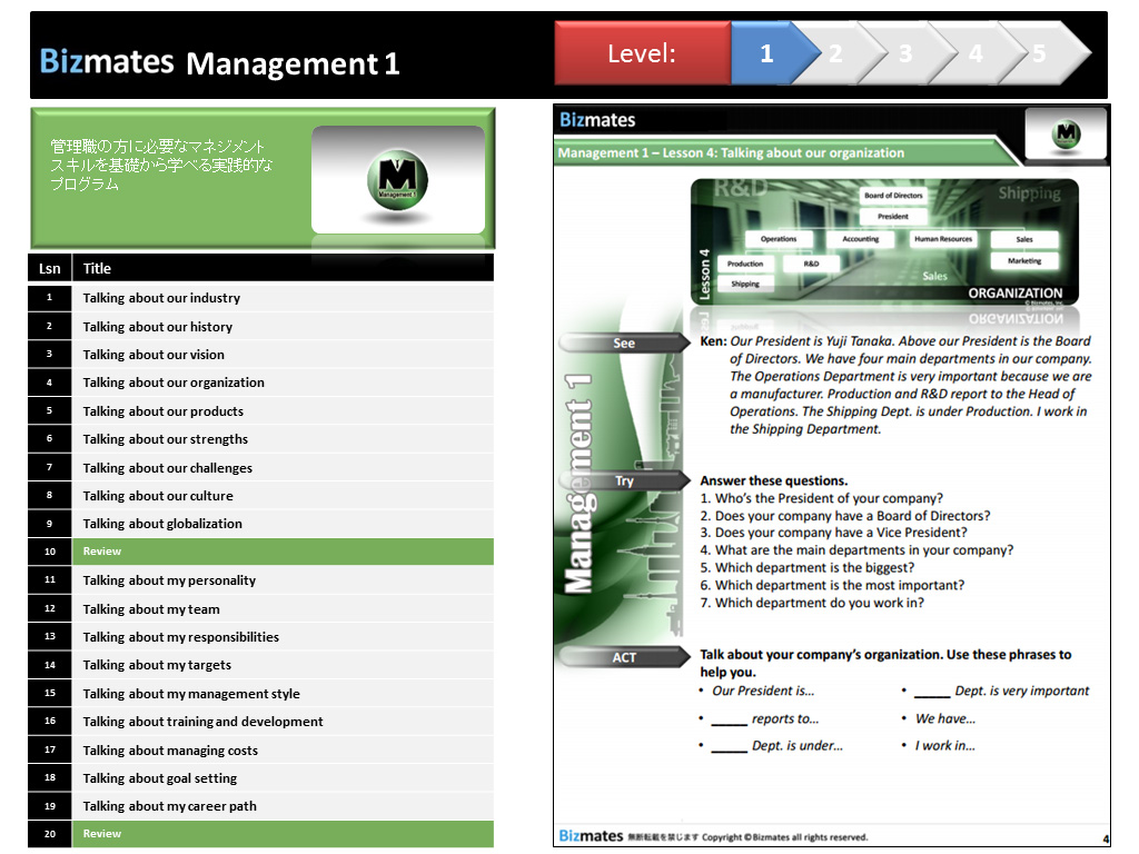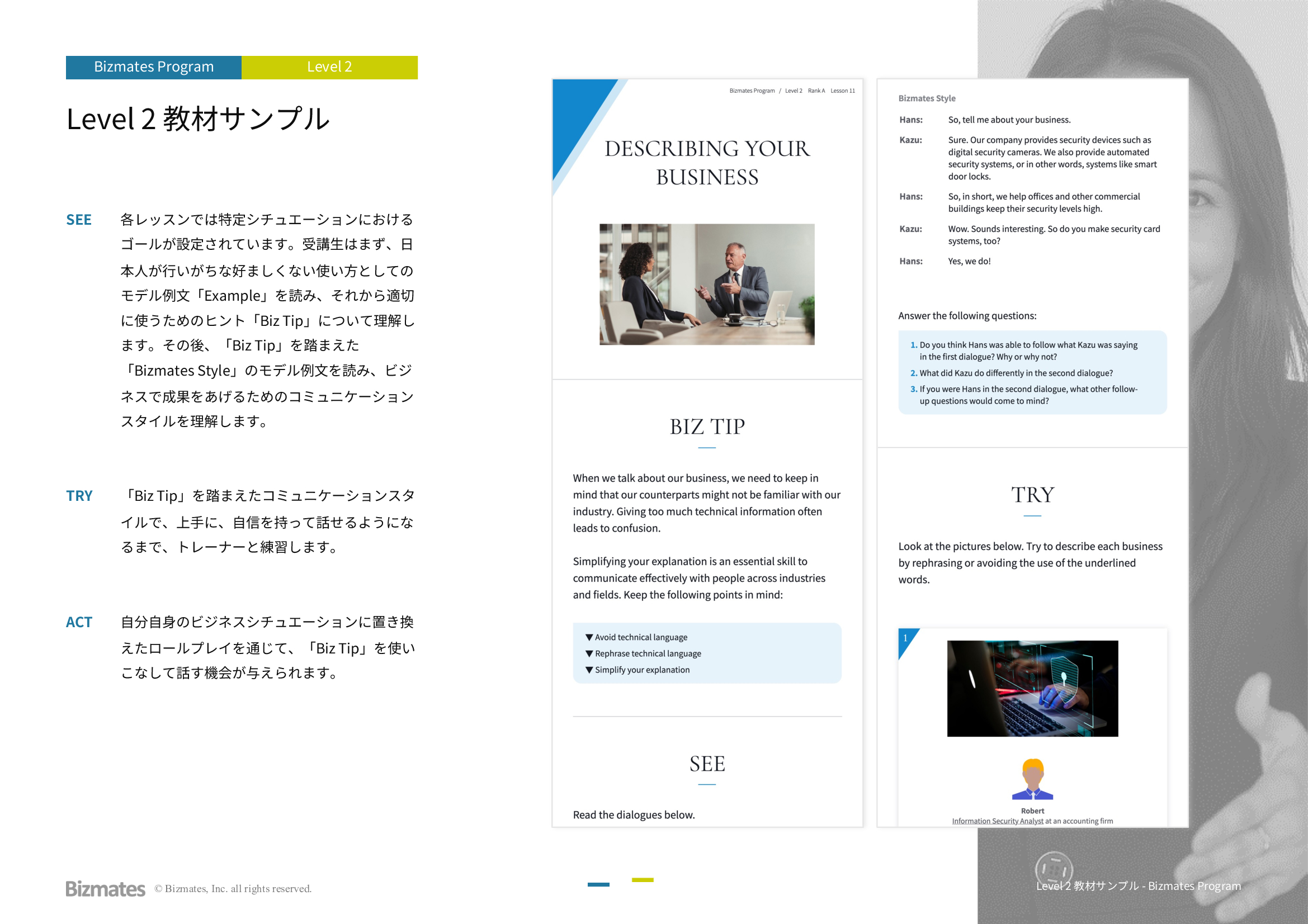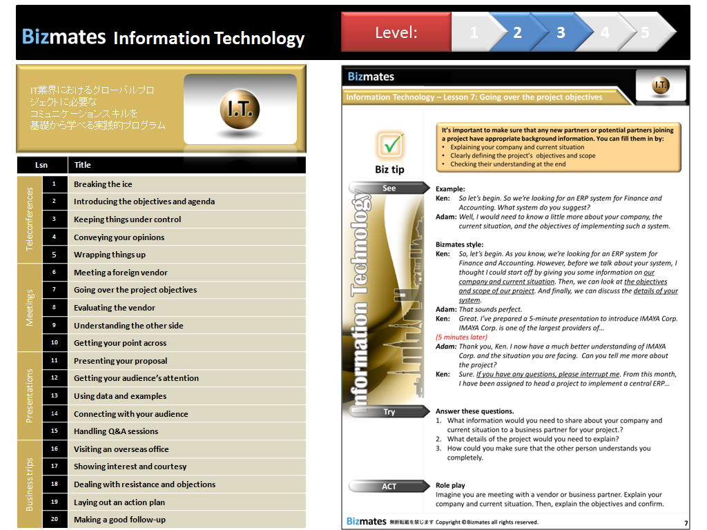 すぐに仕事で使える英語を学びます。※無料体験レッスンで認定されたレベルの範囲で選ぶことができます