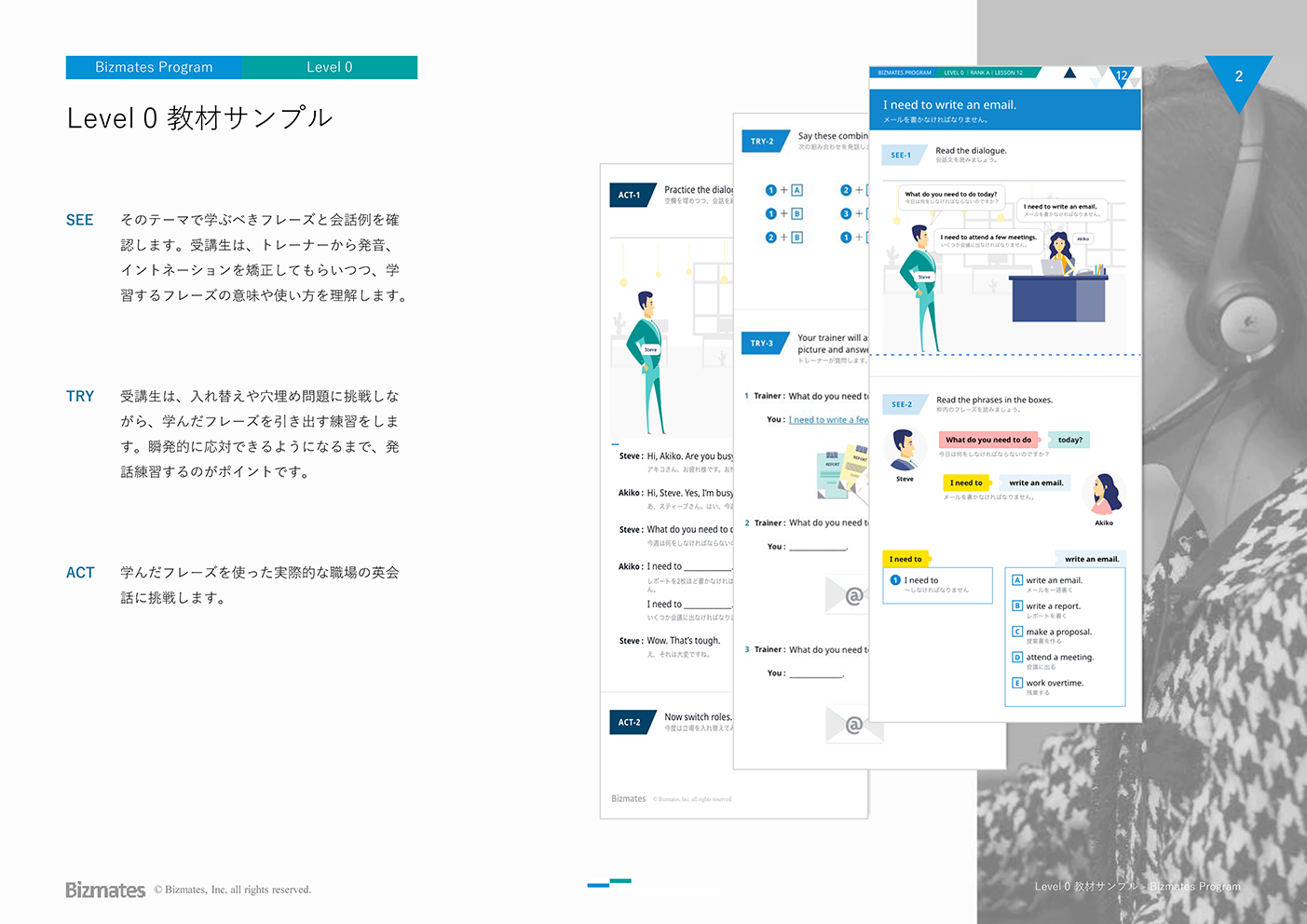 すぐに仕事で使える英語を学びます。※無料体験レッスンで認定されたレベルの範囲で選ぶことができます。