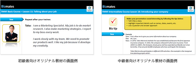 同プログラムでは、海外クライアントとの自己紹介や挨拶、英語での電話応対、自社やサービス内容について英語で説明するような、東京海上日動における日常の業務に直結した英語スキルを修得できます。また、同教材の理解を深めるためのオリジナル動画教材も合わせて提供し、自己学習をサポートします。