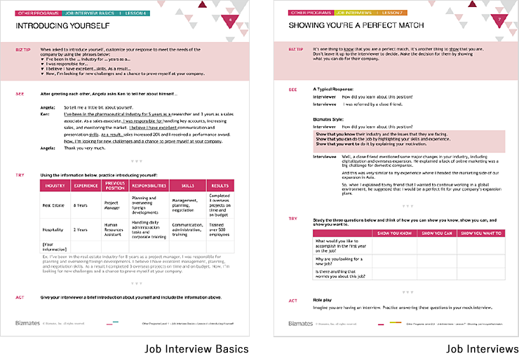 こうしたニーズの高まりを受け、Bizmatesでは、自分が求めるキャリア形成と企業が合っているかを見極め、“効果的なコミュニケーションスキル”を使って英語面接を突破することを目的とした新しい学習プログラムを開発いたしました。書類選考を突破するための履歴書の書き方などの準備の方法から学び、受け身でいるのではなく、面接官に自分が最適な候補者であることをきちんと理解してもらえるコミュニケーションの取り方を実践練習します。