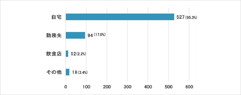 レッスンを受講する場所は自宅と回答した人が95.3%と最多。次いで勤務先が17.0%という結果に。