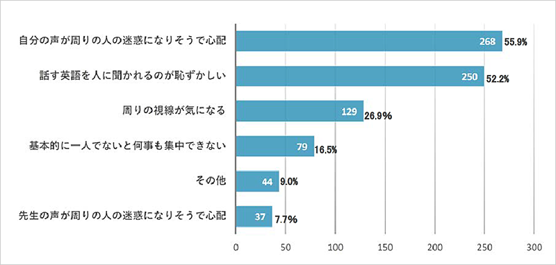- 自分の話す声が周りの人の迷惑になりそうで心配と回答した人が55.9%、英語を人に聞かれるのが恥ずかしいと52.2%が回答。周りの視線が気になる人も26.9%という結果に。