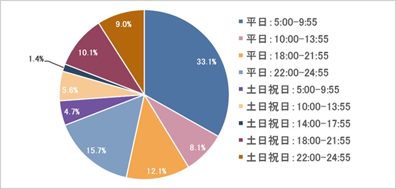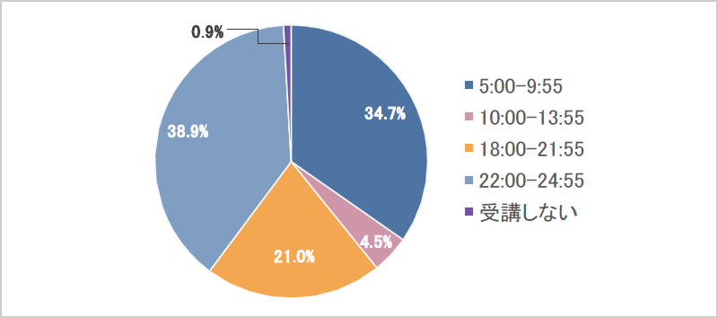- 主な受講時間の傾向として、平日はビジネスパーソンの平均的な退勤後の時間帯となる18時~21時55分が21.0%、22時~24時55分が38.9%と半数以上にのぼり、5時~9時55分の出勤前の時間帯は34.7%という結果となりました。また、土日祝日の受講傾向として、それぞれの時間帯に分散されており、受講しない人の傾向も強くみられました。