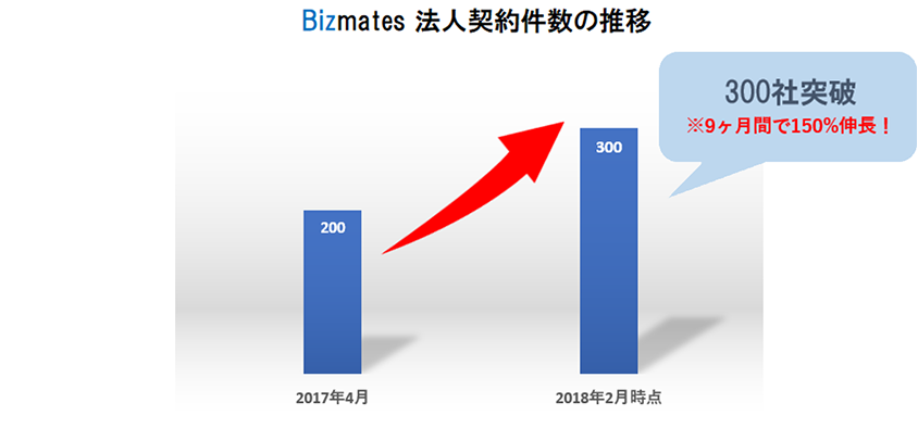 ビジネス特化型オンライン英会話学習サービスを展開するビズメイツ株式会社(東京都千代田区、代表取締役社長:鈴木伸明 以下「ビズメイツ」)は、オンライン英会話Bizmates(ビズメイツ)の導入企業社数が9ヶ月間で150%伸長し、累計300社を突破したことを発表します。