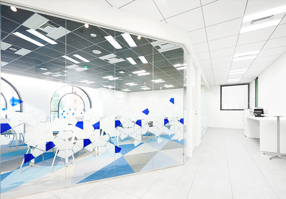 - エレベーターを降りると、洗練されたエントランスが皆様をお迎えします。エントランス横のガラス奥には、幾何学模様を基調としたデザインの明るいスペースが広がっています。