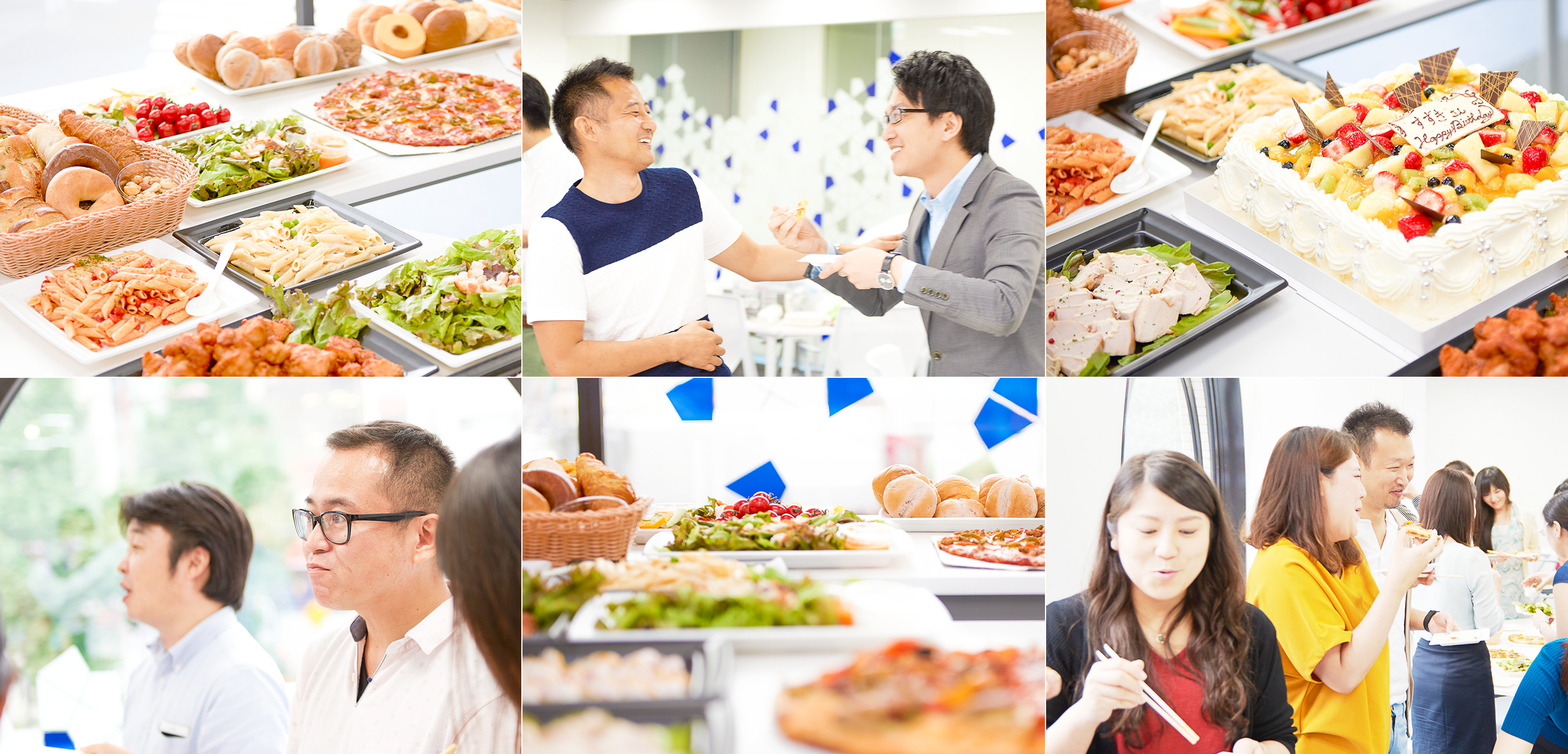 - 毎月社内で行っているランチパーティーでは、ピザ、サンドイッチ、オードブル等、多彩な食事を楽しめます。