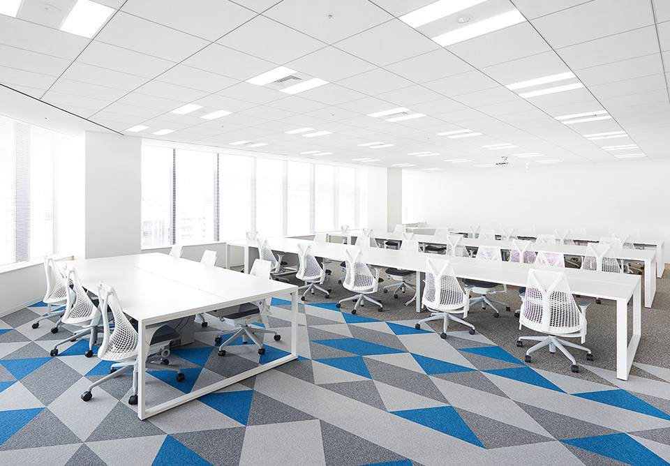 - グループ形式にも、講義形式にも対応可能な”台形デスク”は、幾何学模様をコンセプトとしたオフィスデザインを踏襲し、選ばれました。室内はスクリーン、プロジェクター、マイクが完備され、来場された方に最高の「学び」や「交流」の場をもたらします。